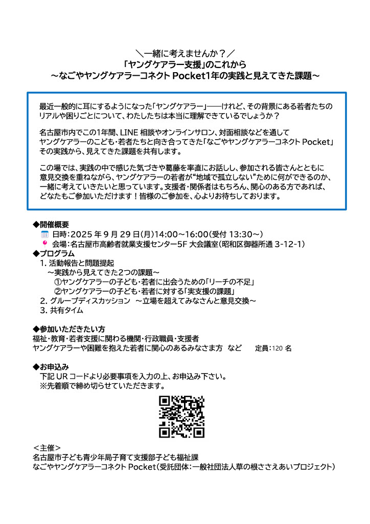 名古屋市内でこの1年間、LINE相談やオンラインサロン、対面相談などを通してヤングケアラーのこども・若者たちと向き合ってきた「なごやヤングケアラーコネクトPocket」その実践から、見えてきた課題を共有します。