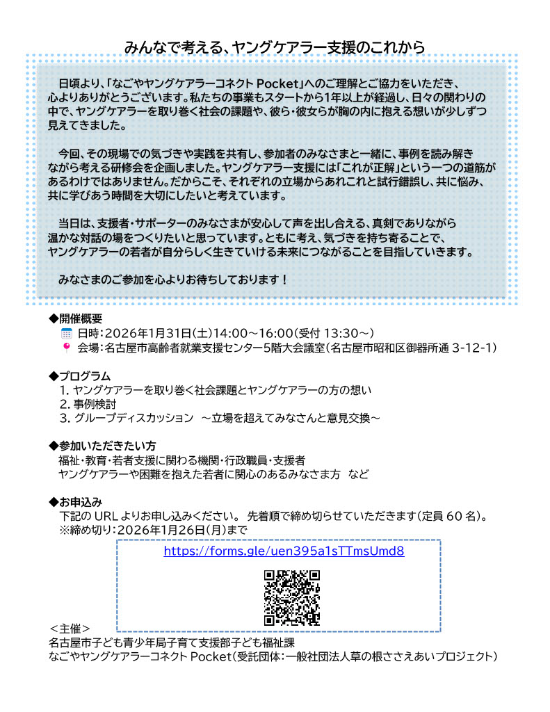 来年2026年1月31日(土)、草の根が名古屋市から受託している「なごやヤングケアアラー コネクトPocket」の研修会「みんなで考える、ヤングケアラー支援のこれから」を開催します。